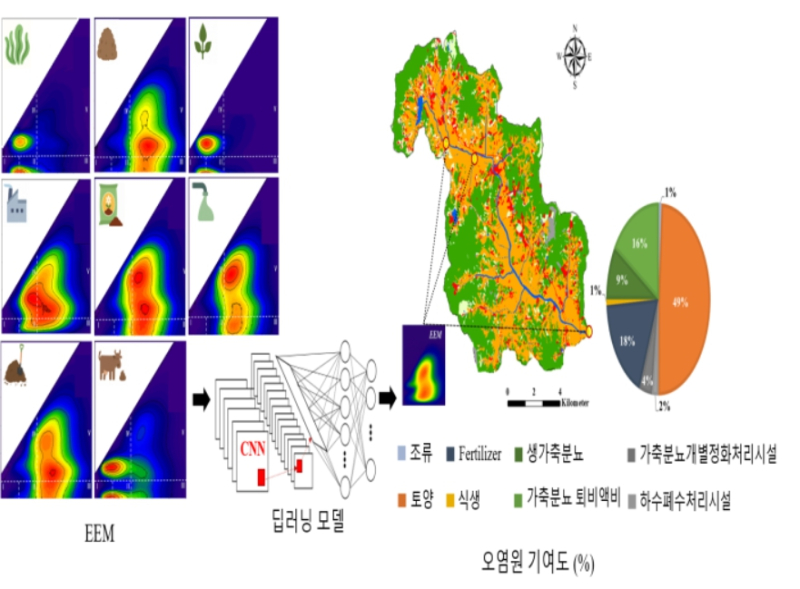 이 모형은 가축분뇨·하수·토양 등 서로 유사한 유기 오염 특성을 가진 오염원을 구분하기 위해 선행 연구에서 사용됐던 특정 파장을 이용한 지표가 아닌 형광 피크(Peak) 위치와 강도 정보를 모두 포함하는 2차원 ‘여기-방출 행렬(EEM) 이미지’를 사용해, 이를 AI 심층학습(딥러닝) 모형에 적용해 오염원 분류 정확도를 높였다. 이에 따라 유역 내 다양한 오염원의 종류를 신속하고 정밀하게 분석 및 정량화할 수 있게 됐다.