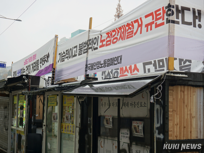 동대문구를 벤치마킹하며 강력한 정비에 나선 광진구는 오히려 노점상 갈등을 키운 사례로 꼽힌다. 구는 지난 9월 건대입구역 인근 ‘타로 거리’ 노점의 61%를 일시에 철거했다. 이후 노점상들이 같은 자리에 천막 농성장을 설치하고 구청을 항의 방문하는 등 갈등이 반복됐다.