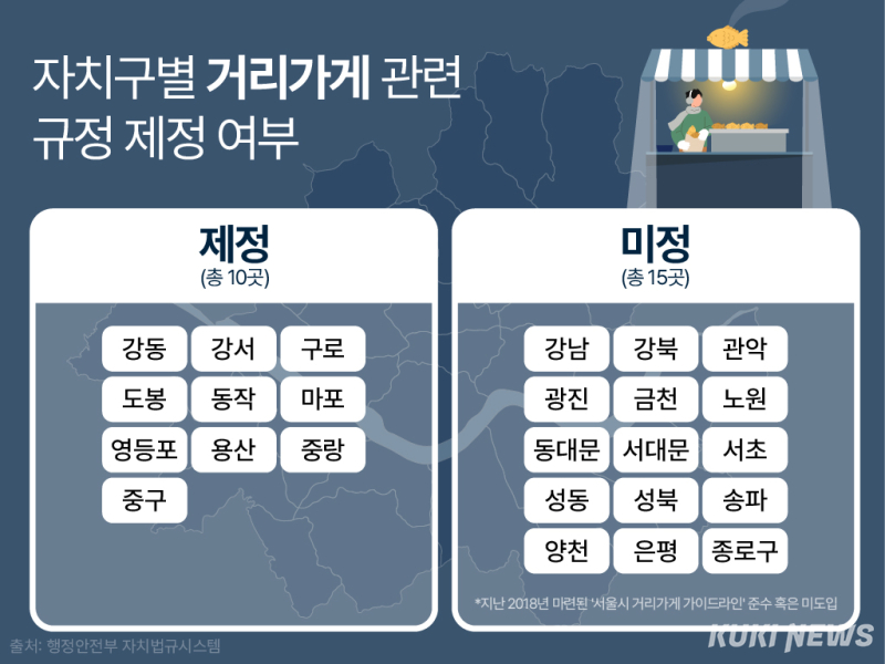 그러나 이를 관리하는 방식은 자치구마다 크게 다르다. 강동·강서·구로·도봉·동작·마포·영등포·용산·중랑·중구 등 10개 구는 ‘거리가게 관리·운영 조례’를 제정해 허가제 근거를 갖췄다. 반면 강남·강북·관악·광진·금천·노원·동대문·서대문·서초·성동·성북·송파·양천·은평·종로구 등 15개 구는 서울시 가이드라인만 참고하거나 허가제를 운영하지 않고 있다.