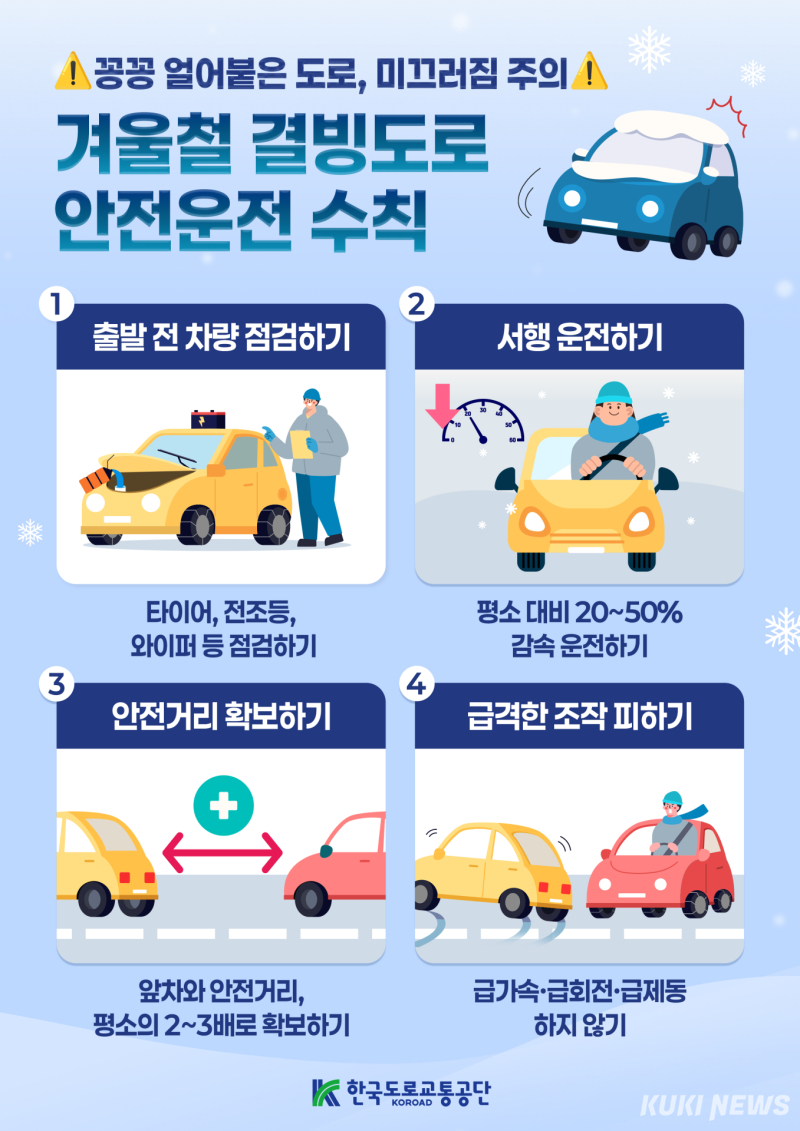 결빙도로 안전운전 수칙은 △운행 전 기상정보와 결빙 취약 구간 확인 △주행 시 앞차와 안전거리, 평소 2~3배 확보 △운전 중 급격한 제동이나 운전대 조작 금물 등이다.
