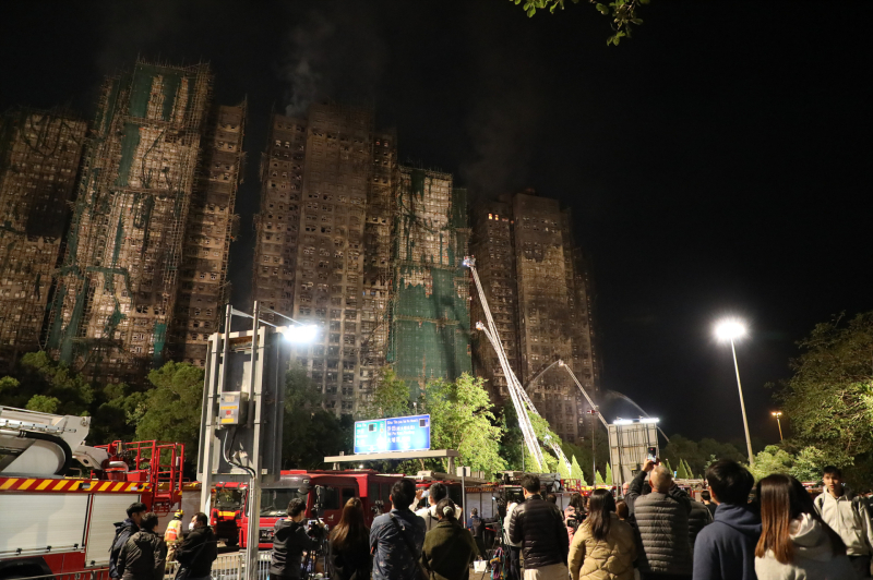 27일(현지시간) 오후 홍콩 북부 타이포의 고층 아파트 단지 ‘웡 푹 코트’(Wang Fuk Court)에서 잔불과 열기로 인한 회색 연기가 피어오르고 있다. 27일(현지시간) 오후 홍콩 주민들이 대형 화재가 발생한 뒤 진압 작업이 진행 중인 북부 타이포의 고층 아파트 단지 ‘웡푹 코트’(Wang Fuk Court)를 바라보고 있다.27일(현지시간) 오후 홍콩 북부 타이포의 고층 아파트 단지 '웡 푹 코트'(Wang Fuk Court) 인근 육교에 화재 피해자를 추모하는 의미의 하얀 꽃이 놓여 있다.