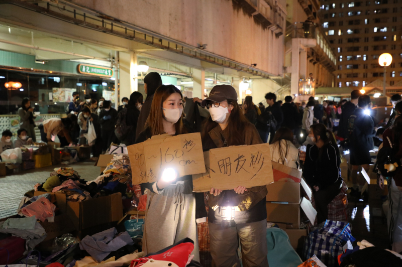 27일(현지시간) 오후 홍콩 북부 타이포의 고층 아파트 단지 ‘웡 푹 코트’(Wang Fuk Court) 인근 광장에서 자원봉사자들이 구호물품인 의류 등을 나눠주고 있다.
