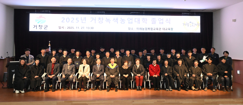 거창군은 지난 27일 미래농업복합교육관에서 ‘2025년 거창녹색농업대학 졸업식’을 열고 딸기학과와 올해 새롭게 개설된 블루베리학과에서 총 61명의 졸업생을 배출했다.