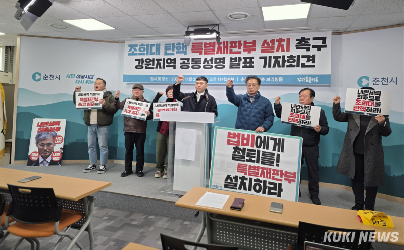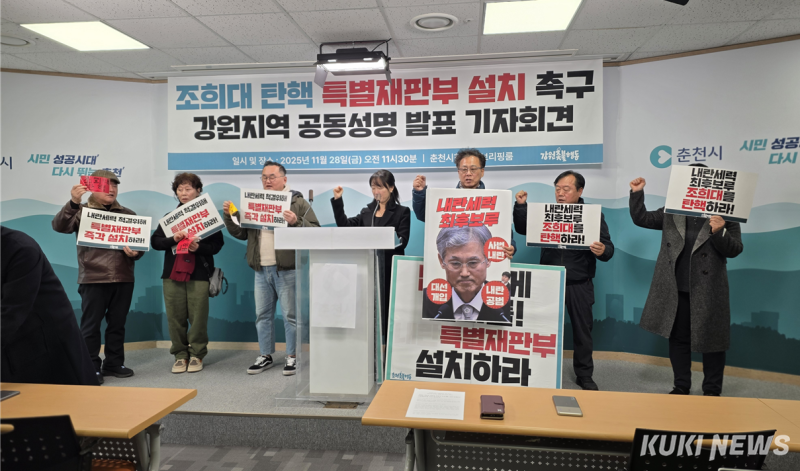 강원촛불행동과 춘천시민연대 등 강원지역 20개 단체와 촛불시민 120명은 28일 춘천시청에서 기자회견을 갖고, 내란과 국정 농단에 관한 법적 수사와 재판이 조희대 사법부에 가로막혀 지연되고 있다고 지적했다.