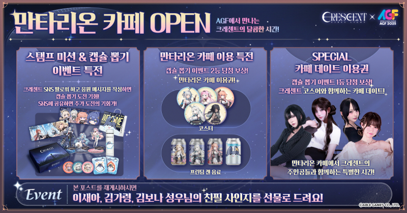 특히 출시 전 소식을 가장 빠르게 확인할 수 있는 SNS 팔로우 이벤트, 그리고 크레센트 응원 메시지월 작성 이벤트에 참여하면, 부스 콘셉트에 맞춘 카페 이용권과 코스어와 함께하는 카페 데이트 체험 기회가 제공된다. AGF 2025 크레센트 부스에 등장하는 주요 코스터들은 ‘보미’, ‘오미’, ‘삔냥’, ‘리세’, ‘라강’, ‘희야’, ‘린땅’ 등 7명이며. 각각 루네, 유라, 릴리, 비비안, 피오니, 마론, 코튼 등 게임 속 캐릭터로 완벽 변신해 관람객들을 맞이한다.