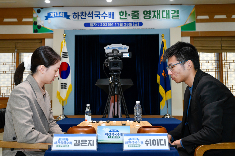 경상남도 합천군 합천정원테마파크 청와대세트장에서 28일 열린 제13기 하찬석국수배 한·중 영재대결에서 김은지 9단이 중국 쉬이디 7단에게 278수 만에 백으로 불계승을 거뒀다. 승리한 김 9단은 29일 신진서 9단과 겨룰 수 있는 자격을 획득했다.