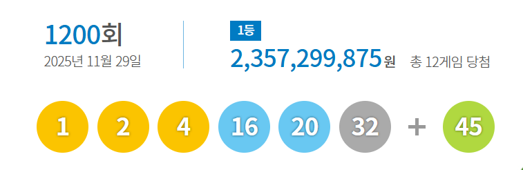 29일 로또복권 운영사 동행복권은 제1200회 로또복권 추첨에서 ‘1·2·4·16·20·32’이 1등 당첨번호로 결정됐고 밝혔다. 2등 보너스 번호는 ‘45’다.