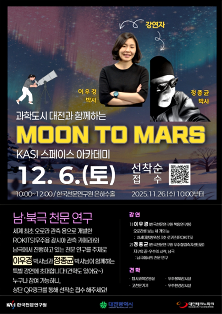 한국천문연구원(이하 천문연)은 오는 6일 본원에서 우주탐사 주제 대중강연 프로그램 ‘Moon to Mars, 과학도시 대전과 함께하는 KASI 스페이스 아카데미’를 개최한다.