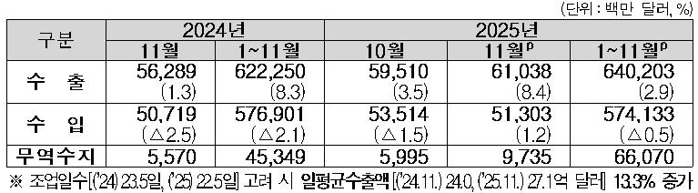 조업일수를 고려한 일평균 수출액은 27억 1000만 달러로 전년 대비 13.3% 증가했다. 조업일수는 지난해 11월 23일에서 올해는 22일로 하루 줄었다.
