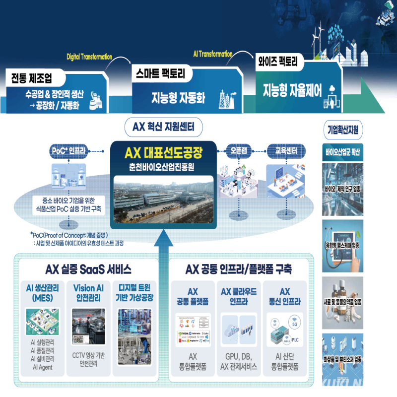육동한 춘천시장은 1일 브리핑을 통해 춘천바이오산업진흥원을 중심으로 강원정보문화산업진흥원 등과 컨소시엄을 구성해 준비한 결과 전국 21개 스마트그린산단이 참여한 "AX 실증산단 구축사업"에 춘천 후평산단을 포함한 10곳이 최종 선정됐다고 밝혔다.