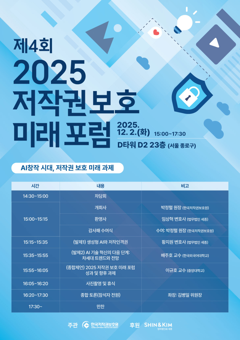 한편 이번 포럼은 법무법인 세종의 후원으로 진행되며, 포럼 후에는 보호원 유튜브 채널(한국저작권보호원 TV)을 통해 영상을 확인할 수 있다. 보호원은 내년에도 ‘저작권 보호 미래 포럼’을 지속 운영하여 급변하는 저작권 보호 환경에 대응하는 정책·법제·기술 논의를 이어갈 계획이다.