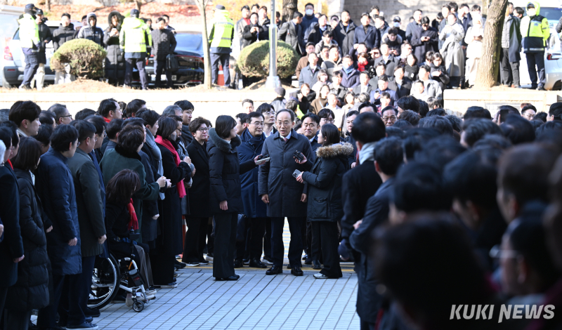 국회 비상계엄 해제 요구 결의안 표결 방해 혐의를 받는 추경호 국민의힘 의원이 구속 전 피의자 심문(영장실질심사)에 출석했다. 국민의힘은 법원을 찾아 정부·여당이 말살을 기도하고 있다며 영장 기각을 압박했다.