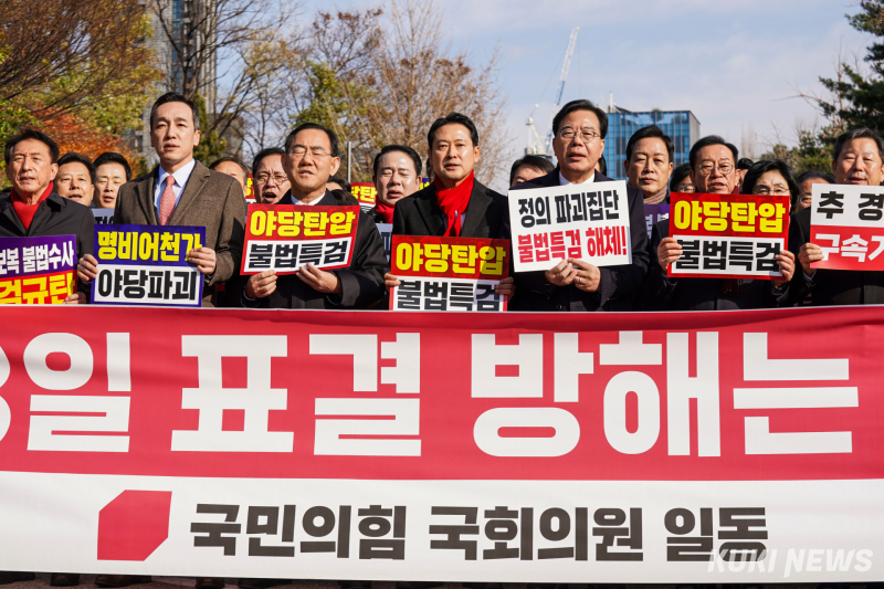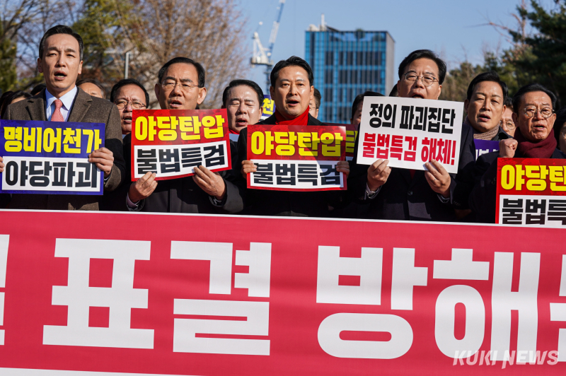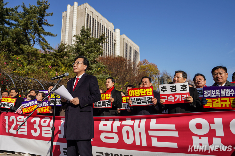이날 법원 앞에서 규탄대회를 연 송언석 국민의힘 원내대표는 “이들의 의도는 분명하다. 우리 당을 내란정당으로 프레임 씌워서 야당을 탄압하고 궤멸시켜 버리겠다는 정치공작에 불과하다”며 “조작된 퍼즐로 꿰어맞춘 영장은 사실과 법리로 따지면 당연히 기각돼야 한다”고 말했다.