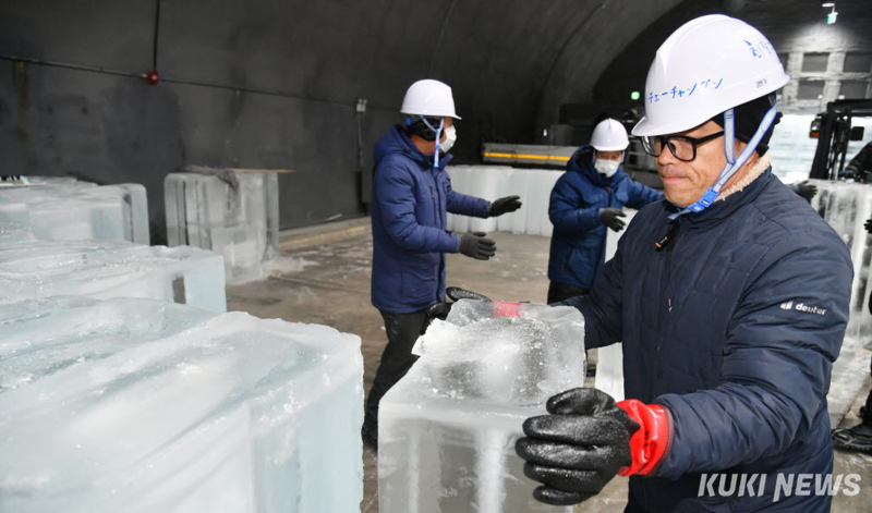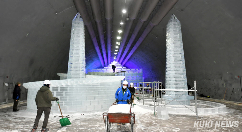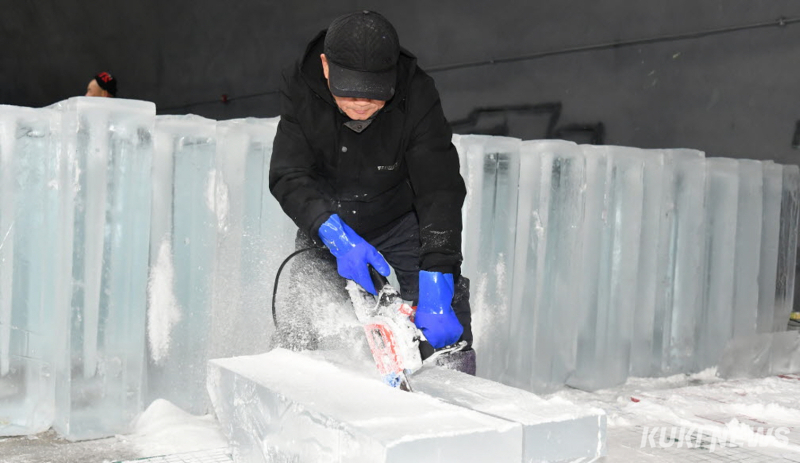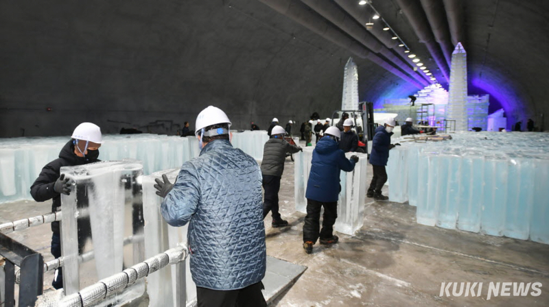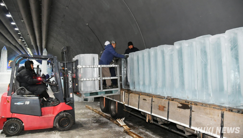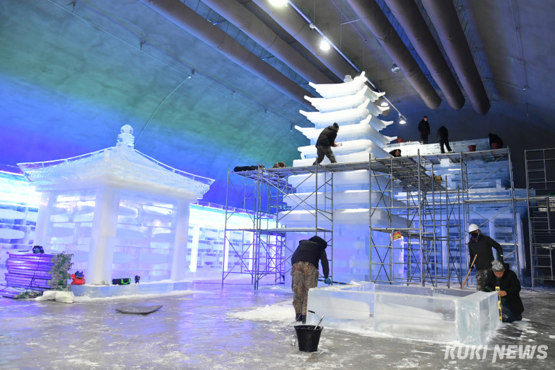 현장에서는 지게차가 얼음을 실어 나르고, 기술자들은 얼음조각을 다듬고 자르며 조형물을 깎아내고 있다.