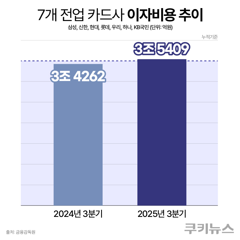 실제로 이자비용은 불어나고 있다. 3분기 말 기준 7개 전업카드사의 이자비용은 3조5409억원으로, 전년 동기(3조4262억원) 대비 3.35% 증가했다. 삼성카드는 4330억원으로 14% 늘며 증가 폭이 가장 컸고, 신한카드(8349억원·7.30%), 현대카드(5554억원·4.65%), 롯데카드(5524억원·1.23%) 순으로 상승세를 보였다.