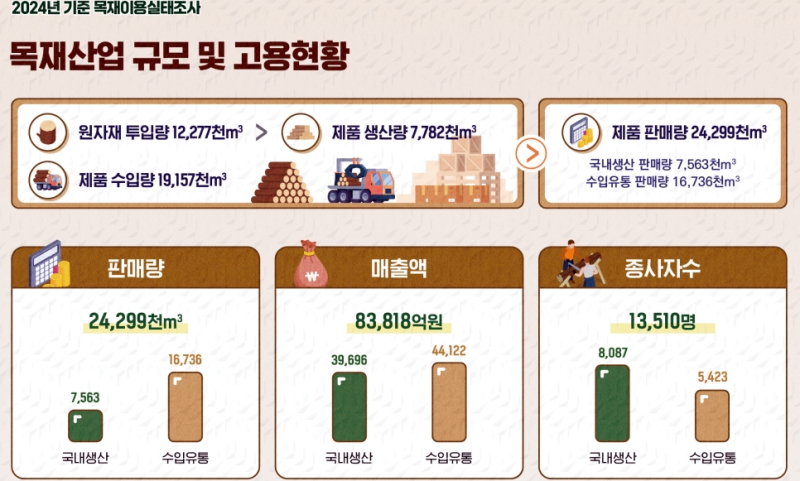 국내 목재생산업체와 목재 수입유통업체 매출액 합계는 8조 3818억 원으로 전년보다 1051억 원 감소했다.