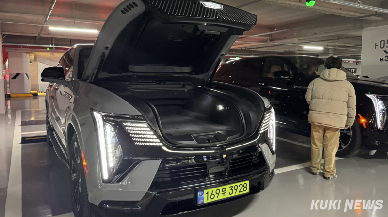 전기차 전용 플랫폼을 쓴 풀사이즈 SUV답게 넓은 공간 활용은 이 차의 핵심 장점이다. 후면 트렁크(3열 폴딩 시) 최대 1958L에 더해 전면부에는 국내 최대 345L 용량의 E-트렁크가 자리 잡고 있다. 행사장에선 기자들이 번갈아 E-트렁크에 들어가 보며 크기를 가늠할 정도였다. 성인 여성 한 명이 앉아도 앞뒤로 여유 공간이 충분하고, 내부에는 비상탈출 버튼까지 있어 혹시 모를 상황을 대비했다. 서영석 캐딜락 마케팅팀 차장은 “E-트렁크는 에스컬레이드 IQ만이 구현할 수 있는 새로운 공간 활용성”이라며 “국내 전기 SUV 가운데 최대 수준의 전면 수납공간”이라고 설명했다.