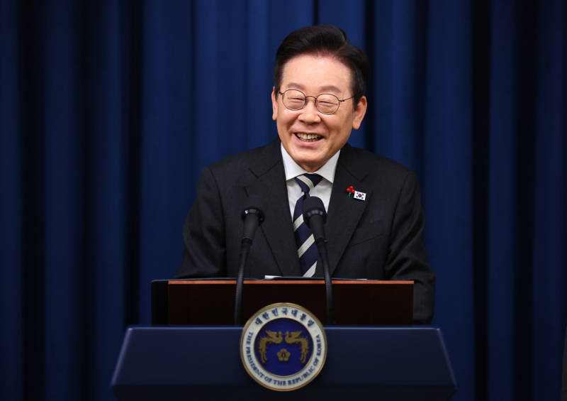 이재명 대통령이 12·3 비상계엄 사태 1주년인 3일 서울 용산 대통령실에서 '빛의 혁명 1주년 대국민 특별성명'을 발표한 뒤 취재진 질문에 답하고 있다.