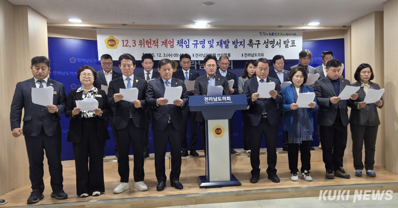 전남도의회는 3일 오전 브리핑룸에서 기자회견을 열고 ‘12‧3 위헌적 계엄에 대한 책임 규명 및 재발방지 촉구’성명을 발표했다.