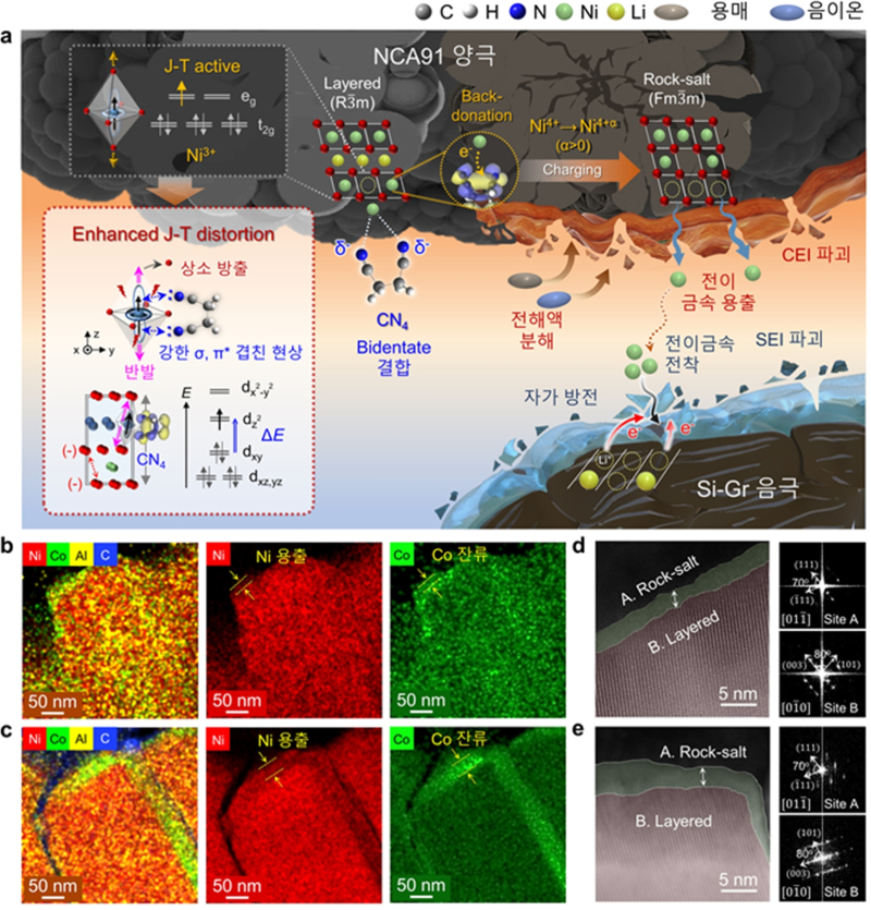 연구팀은 투과전자현미경(TEM), X선 광전자분광법(XPS), EELS 분석 등을 통해 CN4가 하이니켈 양극을 니켈이 부족한 비정상적 층으로 변형시키고, 안정적이어야 할 구조를 암염구조 붕괴시킨다는 사실도 확인했다.