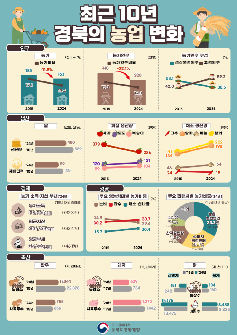이러한 구조 변화 속에서 경북은 전국 시도 중 가장 높은 전업 농가 비율(64.7%)을 유지하고 있으며, 농축산물 판매처 중 소비자 직접판매 비중이 25.7%로 10년 새 7.4%p 증가해 유통 구조의 전문화 및 다양화가 확인됐다.