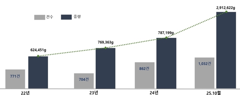 국내 밀반입 마약 적발량이 매년 증가하고 규모도 대형화되는 추세다.