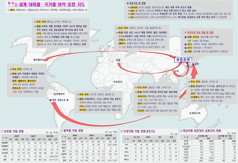 세계적으로도 코카인 생산·유통 규모가 역대 최고치를 기록하며 국내 밀반입 위험도 지속될 전망이다. 실제 올해 강릉 옥계항과 부산신항에서 코카인을 각각 1690㎏, 600㎏ 적발했다.