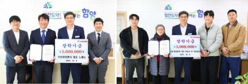 (재)함양군장학회는 (합)함양환경 이효숙 대표와 직원 일동이 500만원, ㈜보원이엔지 노혜능 대표가 500만원을 지역 인재 육성을 위해 장학금으로 기탁했다.