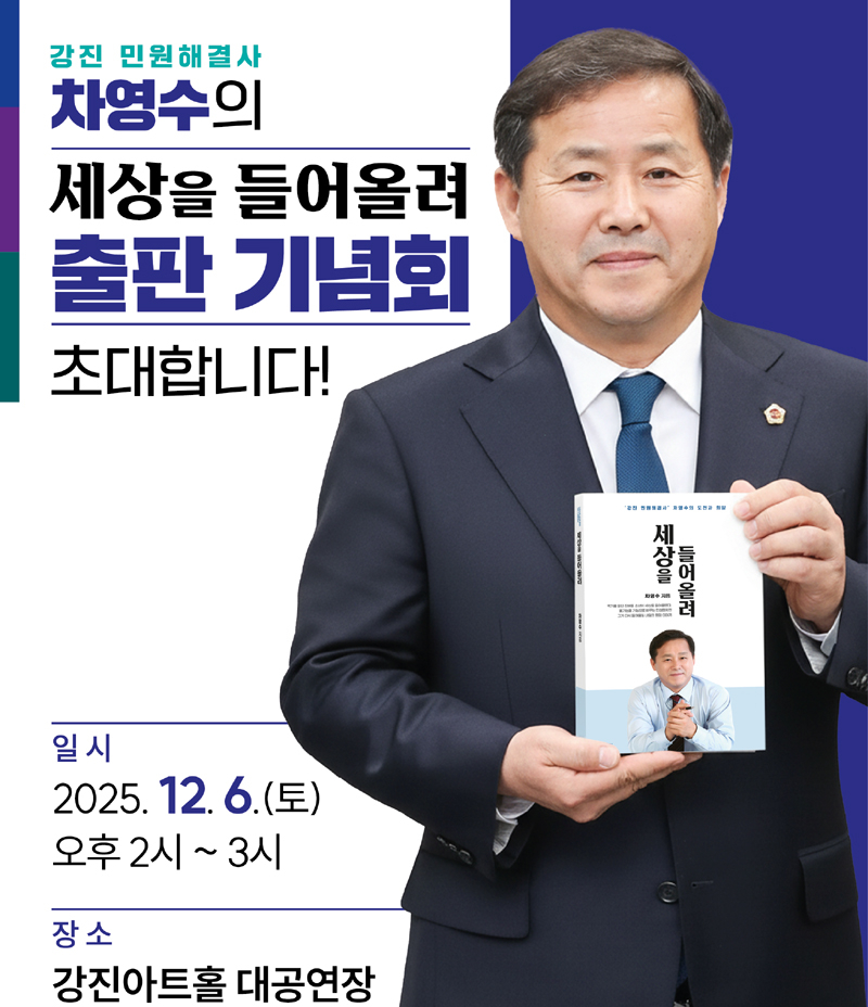 차영수 의원은 6일 강진아트홀 대공연장에서 지역 주민과 김영록 전남도지사, 김태균 전남도의장을 비롯한 도의원, 문금주 국회의원 등이 참석한 가운데 ‘차영수의 나침반이 되어 준 강진’을 주제로 출판기념회를 열었다.