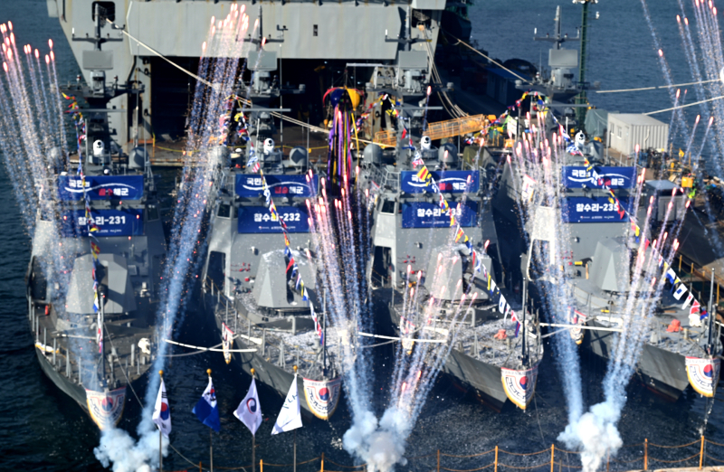 HJ중공업은 8일 해군의 연안방어 전력인 국산 신형고속정 4척의 통합진수식을 가졌다고 밝혔다.