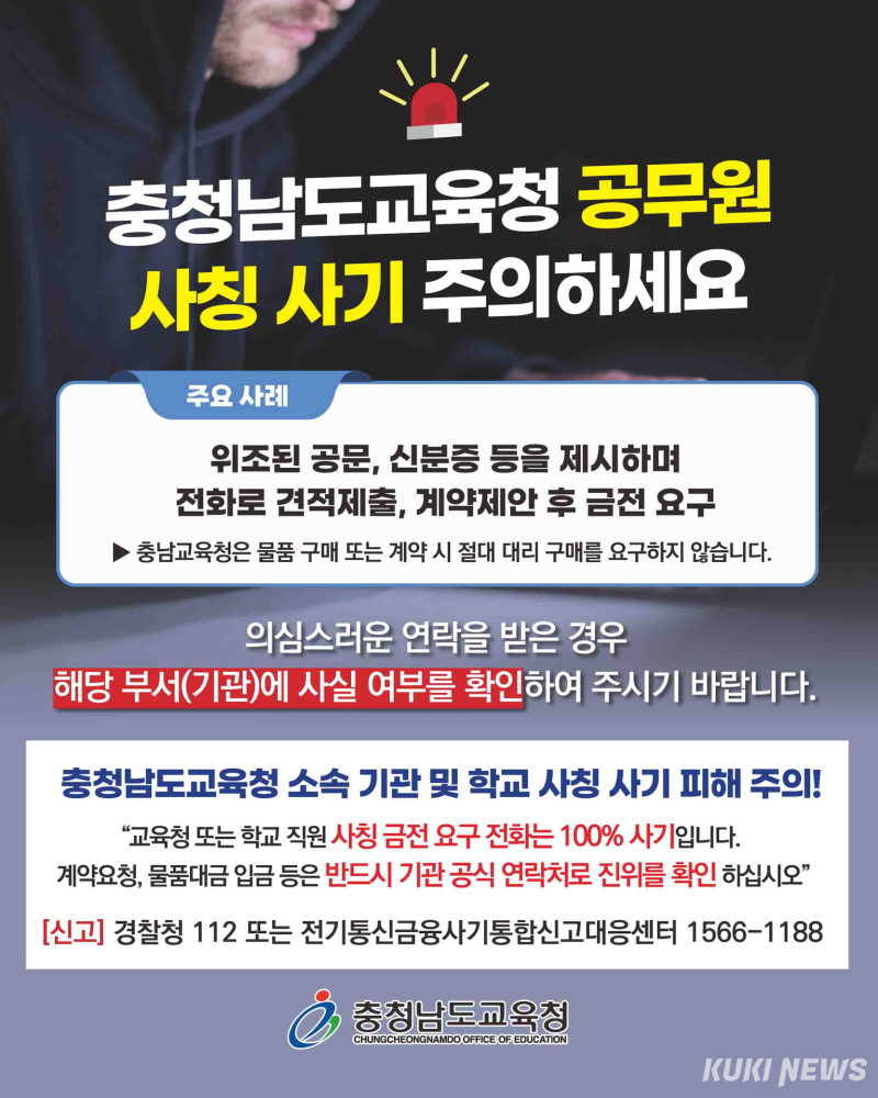 피해 발생 시 신속 신고=만약 이미 금전적 피해가 발생했거나 사기 시도가 명확할 경우, 즉시 담당 경찰서(112)에 신고하고 충남교육청 감사관실에 제보해야 한다.