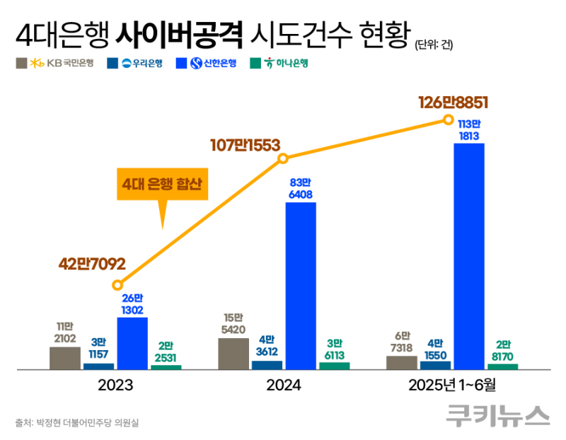 9일 박정현 더불어민주당 의원실이 4대 은행(KB국민·신한·하나·우리은행)으로부터 제출받은 자료를 분석한 결과, 올해 상반기 4대 은행 사이버공격(해킹) 시도 건수는 총 126만8851건이었다. 이는 국내외에서 발생한 모든 사이버 공격 시도를 합산한 것으로, ‘감지’ 단계에서 포착된 모든 외부 공격 신호를 포함한 수치다.