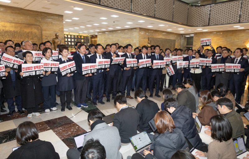 민주당 정청래 대표와 김병기 원내대표 등 소속 의원들은 9일 국회 본관 로텐더홀에서 본회의 입장 전 피켓 시위를 열고 국민의힘의 민생 법안 필리버스터를 규탄했다.