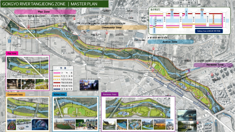 하천을 단순한 치수 중심에서 벗어나 시민의 여가와 생활 체육, 자연 생태가 어우러진 복합 문화 공간으로 확장하기 위해 대상지를 네 가지 주제(테마)로 구성했다. 각 공간은 ▲놀이공간(Play Zone) ▲소통공간(Community Zone) ▲활동공간(Active Zone) ▲화합공간(Harmony Zone)으로 구분된다.