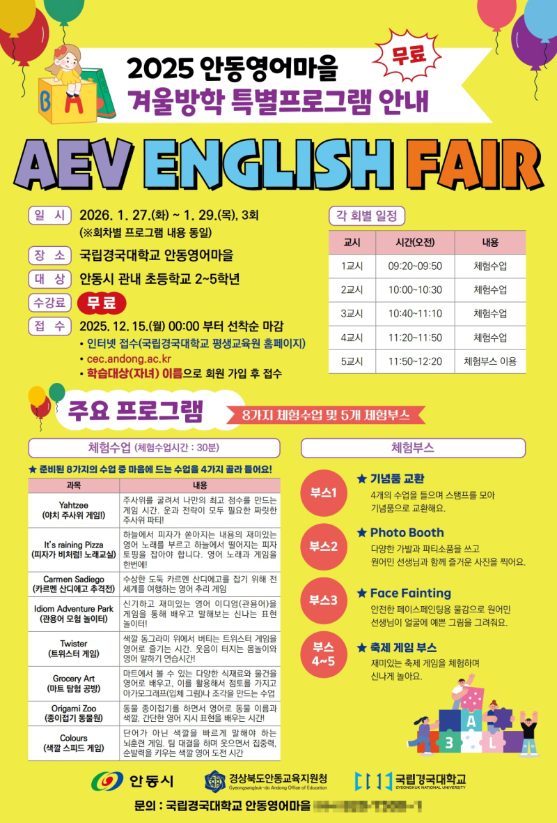 안동시는 오는 내년 1월 27일부터 29일까지 국립경국대학교 내 안동영어마을에서 열리는 겨울방학 특별프로그램 ‘AEV(Andong English Village) English Fair’ 참가 학생을 선착순 모집한다.