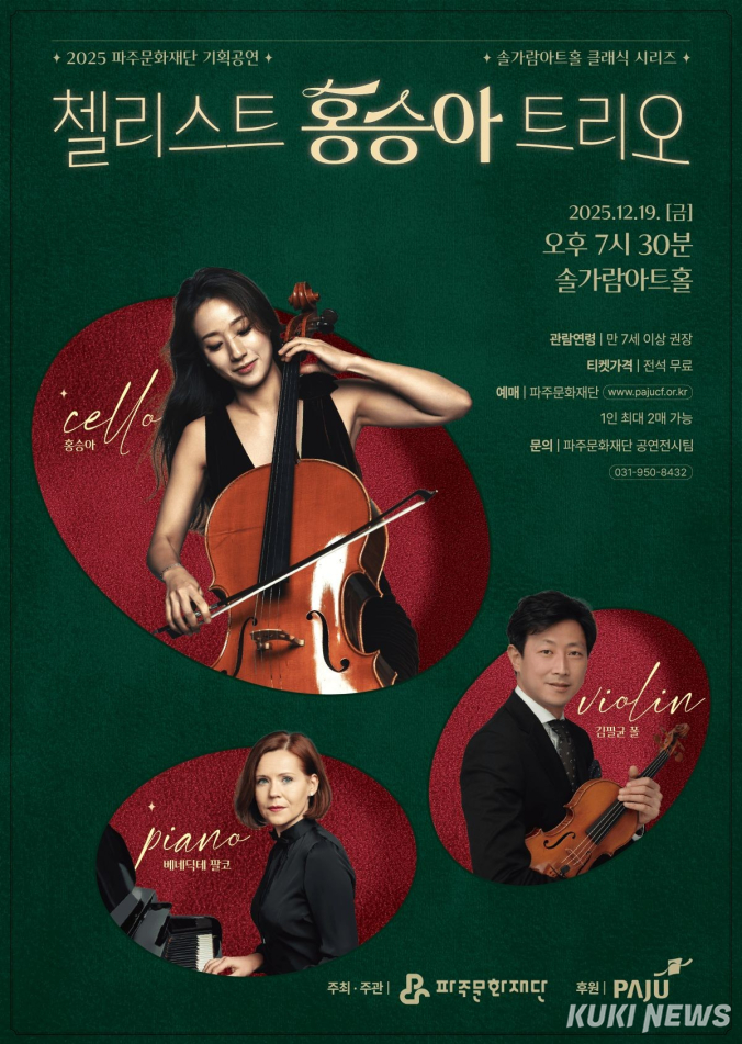 경기 파주문화재단은 오는 19일 오후 7시 30분 솔가람아트홀에서 ‘2025 솔가람아트홀 클래식 시리즈’의 마지막 공연으로 '첼리스트 홍승아 트리오' 무대를 선보인다고 15일 밝혔다. 이번 공연은 한 해를 마무리하는 연말 무대로, 피아노 트리오 편성의 깊이 있는 실내악 연주를 통해 관객들에게 클래식 음악의 울림을 전할 예정이다.