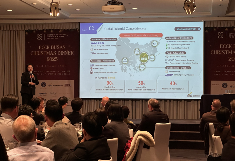 부산진해경제자유구역청(청장 박성호)은 11일 부산 웨스틴조선호텔에서 열린 ‘ECCK Busan Christmas Dinner 2025’에 특별 초청돼 주한유럽상공회의소(ECCK) 회원사와 유관기관 관계자를 대상으로 투자유치 활동을 펼쳤다.