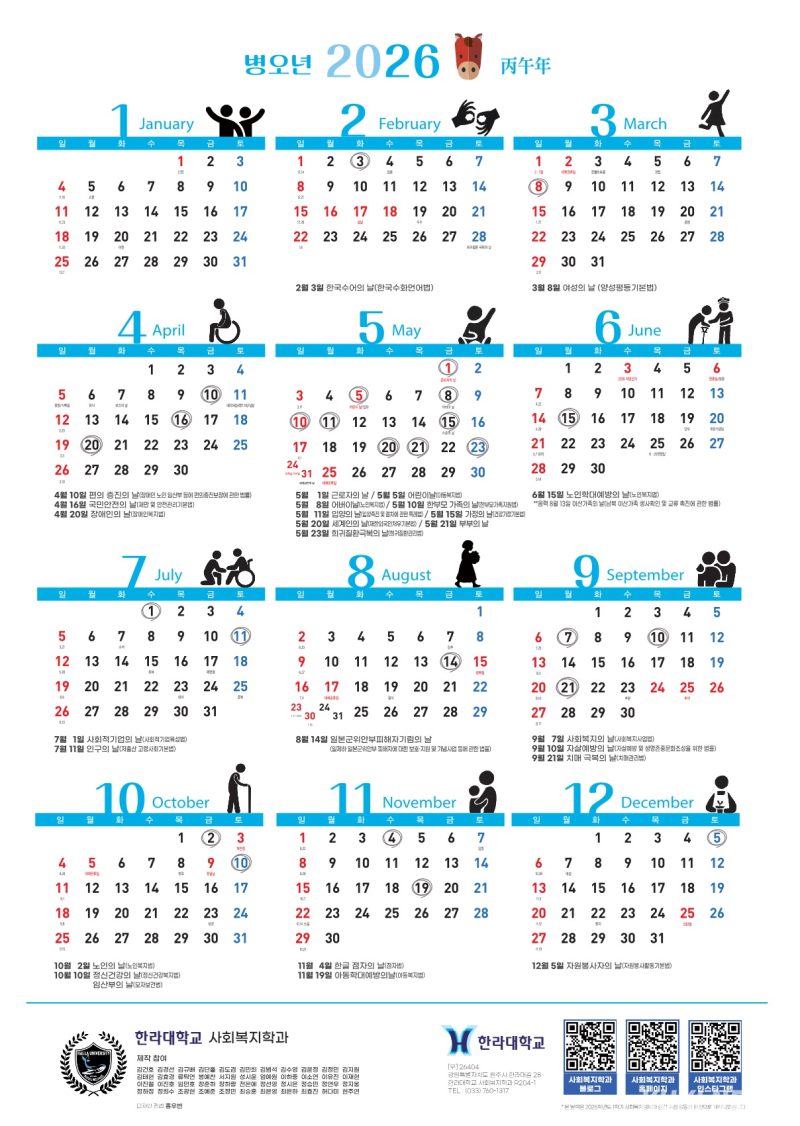 이번 달력은 사회복지학과 학생들이 사회복지 관련 법령에 명시된 주요 기념일 조사는 물론 해당 기념일의 제정 취지와 사회적 의미를 바탕으로 구성한 결과물이다.