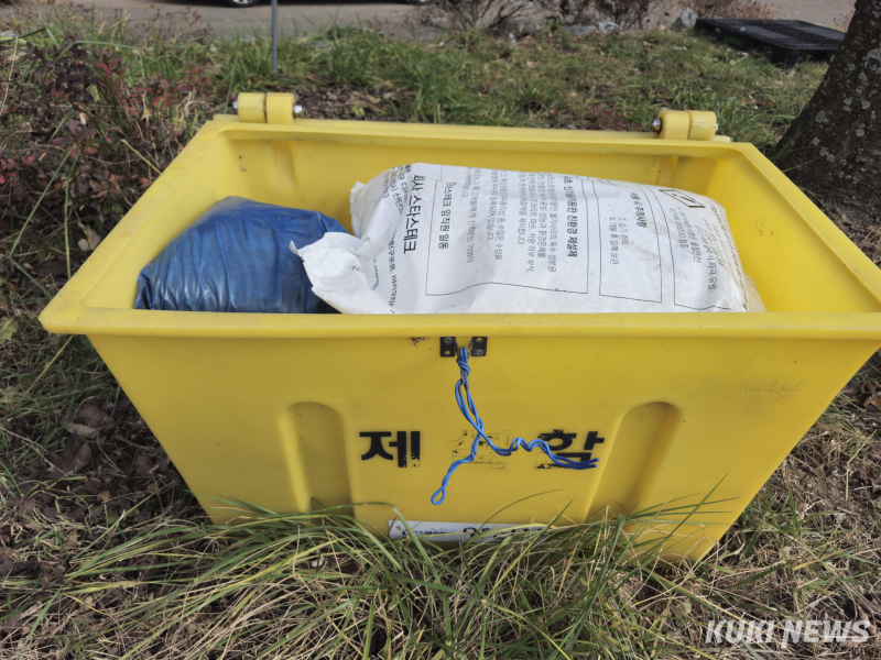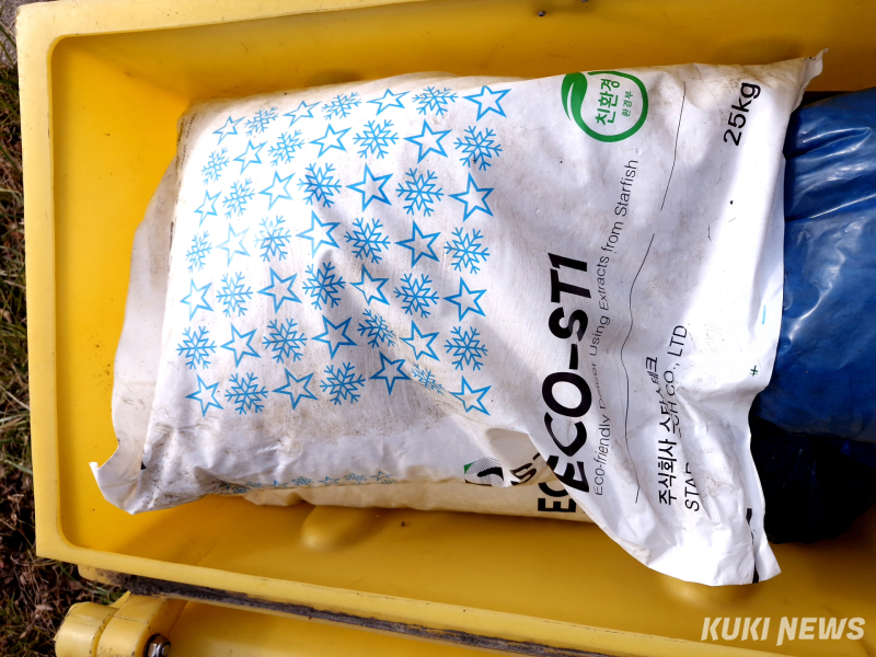 쿠키뉴스가 1022지방도 물금~원동면 구간에 한 제설함을 열어 확인하니 25kg 친환경 염화칼슘 3포대와 모래주머니 4개가 적재돼 있었다. 25kg 염화칼슘은 환경부 '친환경 인증'을 받은 제품으로 스타스테크에서 제조했다. 제설과정에서 염화이온이 나와 철을 부식시키는 등의 문제가 나오는 것을 해결하기 위해 해양 폐기물인 불가사리를 이용한 제품이다.