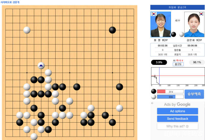 바둑 여왕 김은지 9단이 하림배 우승을 눈앞에 두고 있다. 결승 2국 개전 55분 만에 96% 승률을 기록한 김 9단은 한 달 만에 3개 대회 우승을 달성할 기세다.