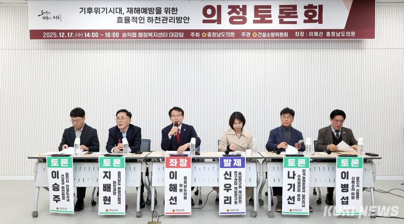 충남도의회는 17일 당진시 송악읍 행정복지센터 대강당에서 ‘기후위기 시대, 재해예방을 위한 효율적인 하천관리 방안’을 주제로 의정토론회를 개최하고, 기후변화로 심화되는 집중호우와 침수 피해에 대응하기 위한 하천관리 정책 방향을 집중 논의했다.