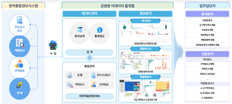 감염병 빅데이터 플랫폼에는 질병청이 방역통합정보시스템을 통해 수집한 감염병 신고·보고·역학조사 데이터가 모두 모인다. 질병청은 이를 바탕으로 감염병 통계를 자동 산출하고, 사용자 맞춤형 분석을 수행하는 한편, 가명처리된 연구용 데이터를 민간 연구자에게 제공하고 있다.
