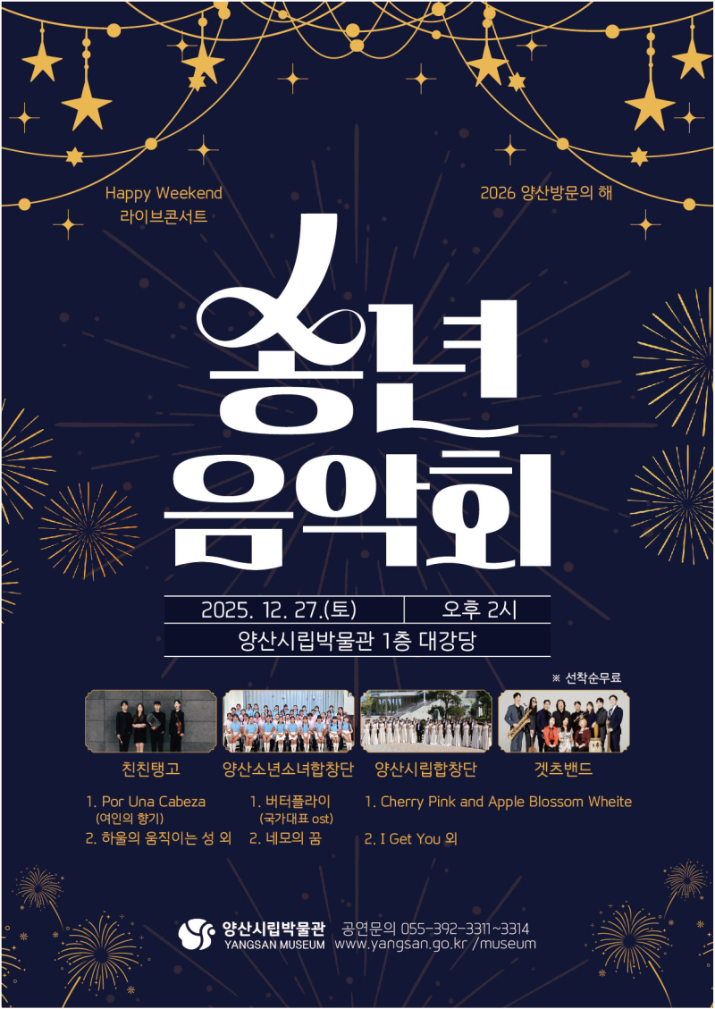 이번 공연은 한 해를 돌아보고 희창찬 새해를 설계할 수 있도록 친친탱고, 양산소년소녀합창단, 양산시립합창단, 겟츠재즈밴드가 출연해 다양한 장르의 음악을 들려줄 예정이다. 공연은 별도의 입장권이나 사전 예약 없이 선착순 무료로 누구나 참석할 수 있다.