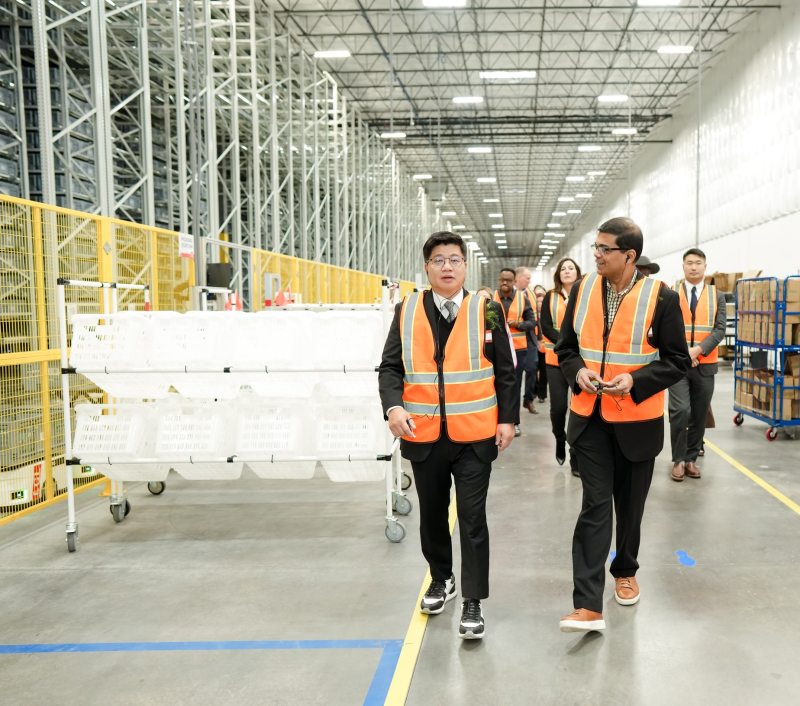 지난 17일(현지시간) 미국 텍사스 주 댈러스-포트워스 도시권 덴턴시 ‘덴턴 풀필먼트센터’ 오프닝 행사에서 강병구 롯데글로벌로지스 대표이사 등 관계자들이 현장을 둘러보고 있다. 롯데글로벌로지스 제공 롯데글로벌로지스, 美 ‘아이허브’ 자동화 풀필먼트센터 정식 오픈