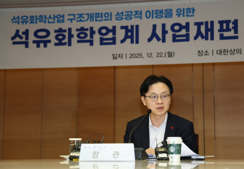 김정관 산업통상부 장관은 22일 서울 대한상공회의소에서 LG화학·롯데케미칼·HD현대케미칼·SK지오센트릭·에쓰오일 등 12개 석유화학 기업 최고경영자(CEO)와 만나 구조조정 이행 방안과 정부 지원책 등을 논의했다.