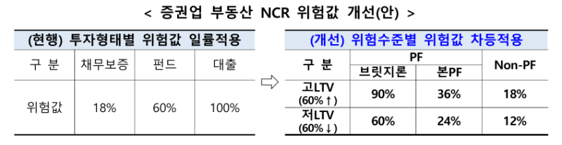 우선 증권사 부동산 규제는 ‘투자 형태’ 대신 ‘실질 위험’에 맞춰 바뀐다. 지금까지는 대출·채무보증·펀드 등 투자수단별로 일률적인 NCR 위험값을 적용해 채무보증에 쏠림이 심했다. 앞으로는 브릿지론·본PF·Non-PF 등 사업장 진행 단계와 담보인정비율(LTV)에 따라 위험값을 차등 적용한다. 특히 부실 우려가 큰 해외 부동산은 현행 60% 이하로 내려가지 않는 최저한도를 둔다. 증권사의 무리한 해외 부동산 확장을 제어하겠다는 의지로 해석된다.