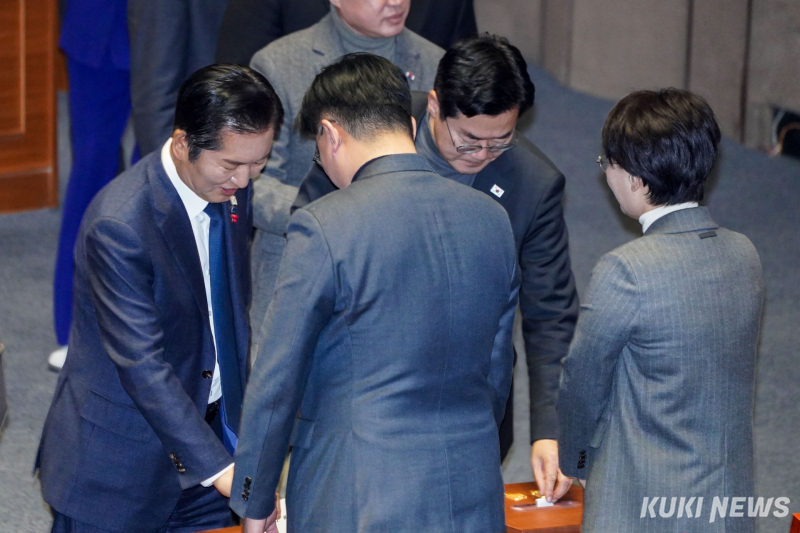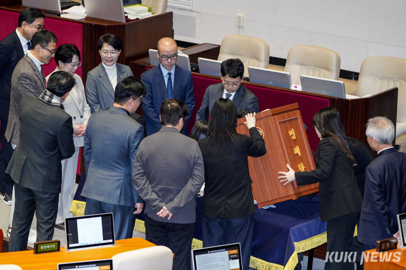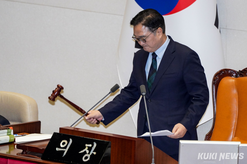 우원식 국회의장이 23일 서울 여의도 국회 본회의장에서 ‘12·3 윤석열 비상계엄 등에 대한 전담재판부 설치 및 제보자 보호 등에 관한 특별법안(대안)에 대한 수정안’이 통과를 발표하며 의사봉을 두드리고 있다. 23일 서울 여의도 국회 본회의장에서 ‘12·3 윤석열 비상계엄 등에 대한 전담재판부 설치 및 제보자 보호 등에 관한 특별법안(대안)에 대한 수정안’ 표결이 진행되고 있다.