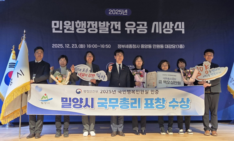 밀양시는 23일 정부세종청사에서 열린 ‘2025년 민원행정발전 유공 시상식’에서 국민행복민원실 우수기관으로 선정돼 국무총리 표창을 수상했다.