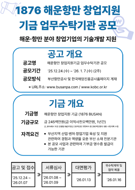 한국해양진흥공사(해진공)는 해운항만 창업지원 플랫폼 '1876 Busan' 기능을 전면 고도화하고 내년 2단계 사업을 이끌어갈 전문 위탁운영기관을 공개 모집한다고 24일 밝혔다.