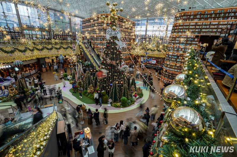 강남구 코엑스몰 별마당도서관에도 실내 공간을 활용한 대형 트리가 설치됐다. 높은 서가 사이 중앙에 설치된 초대형 트리와 계절 장식이 도서관 전체를 하나의 겨울 전시 공간처럼 바꿔 놨다.